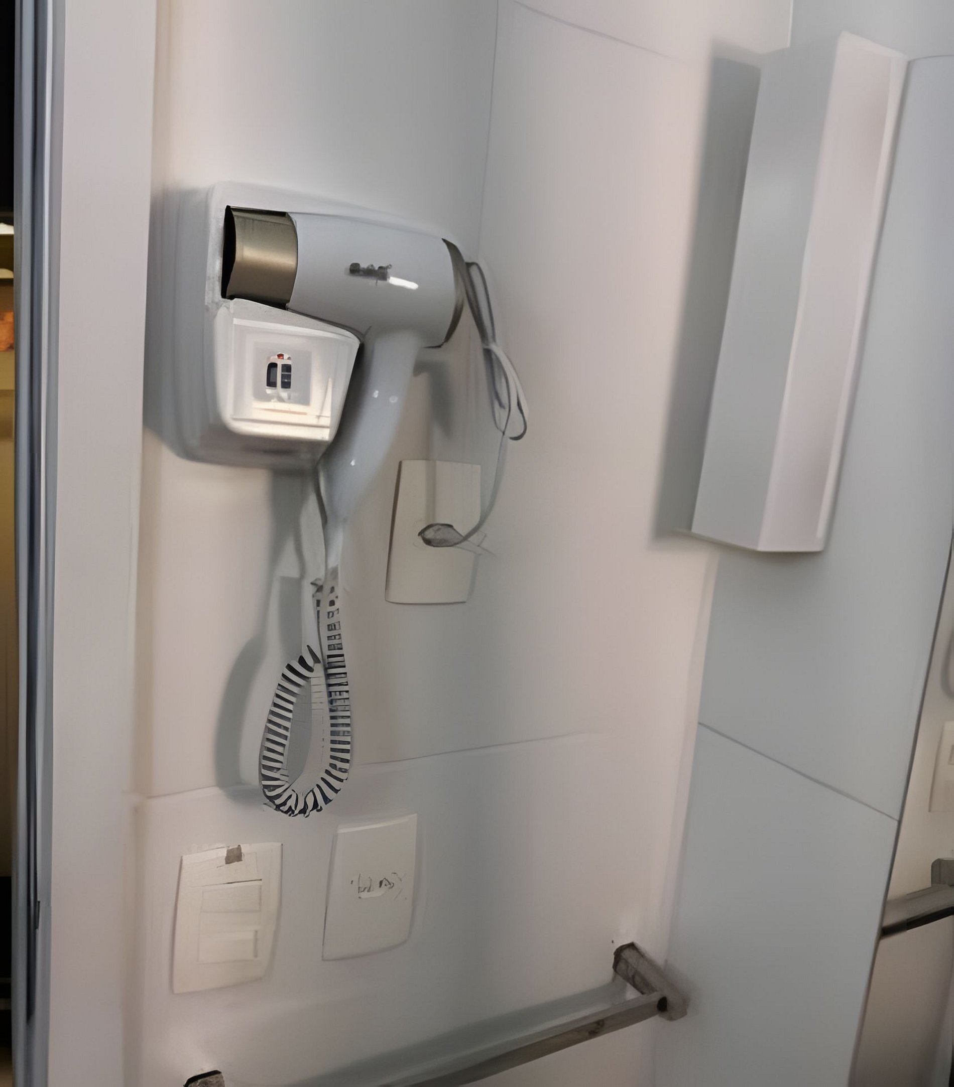 Banheiro com chuveiro a gás e secador de cabelo.