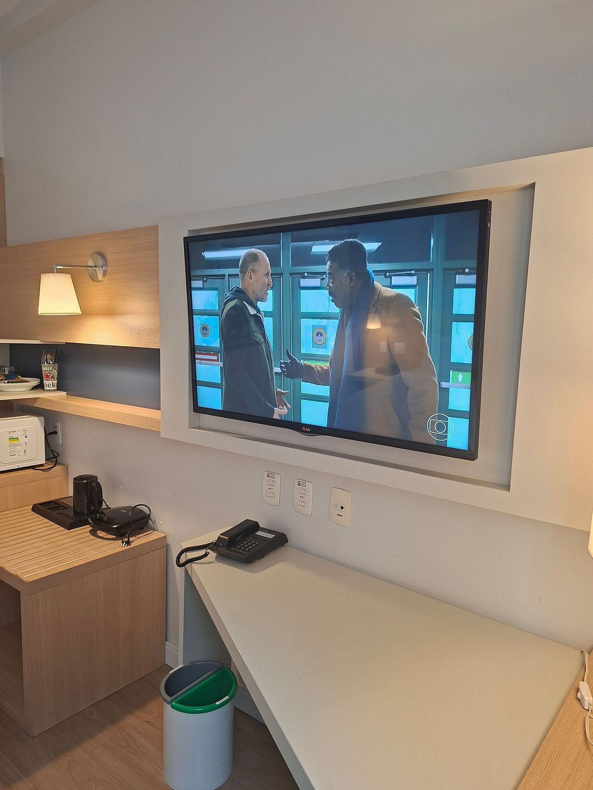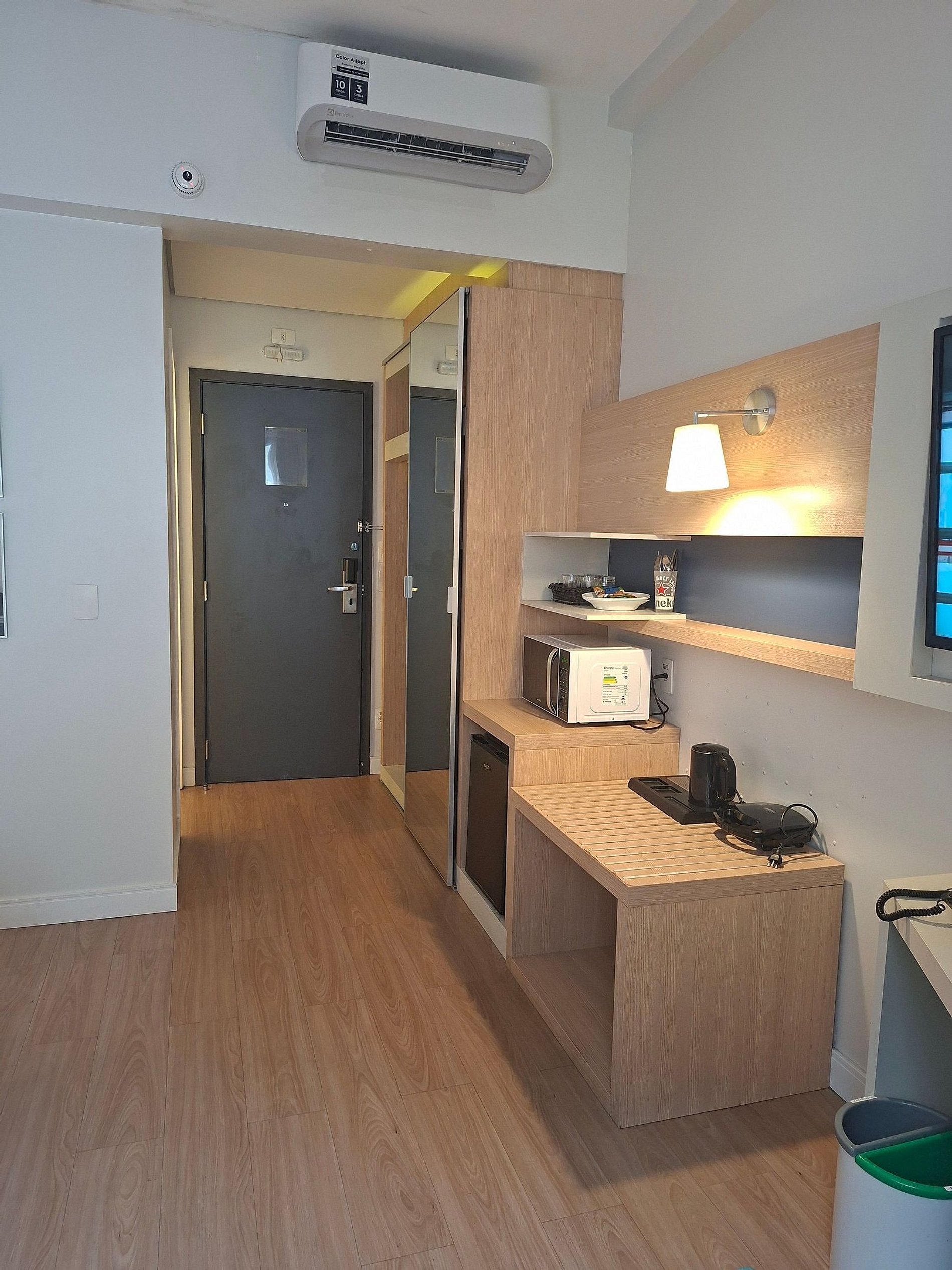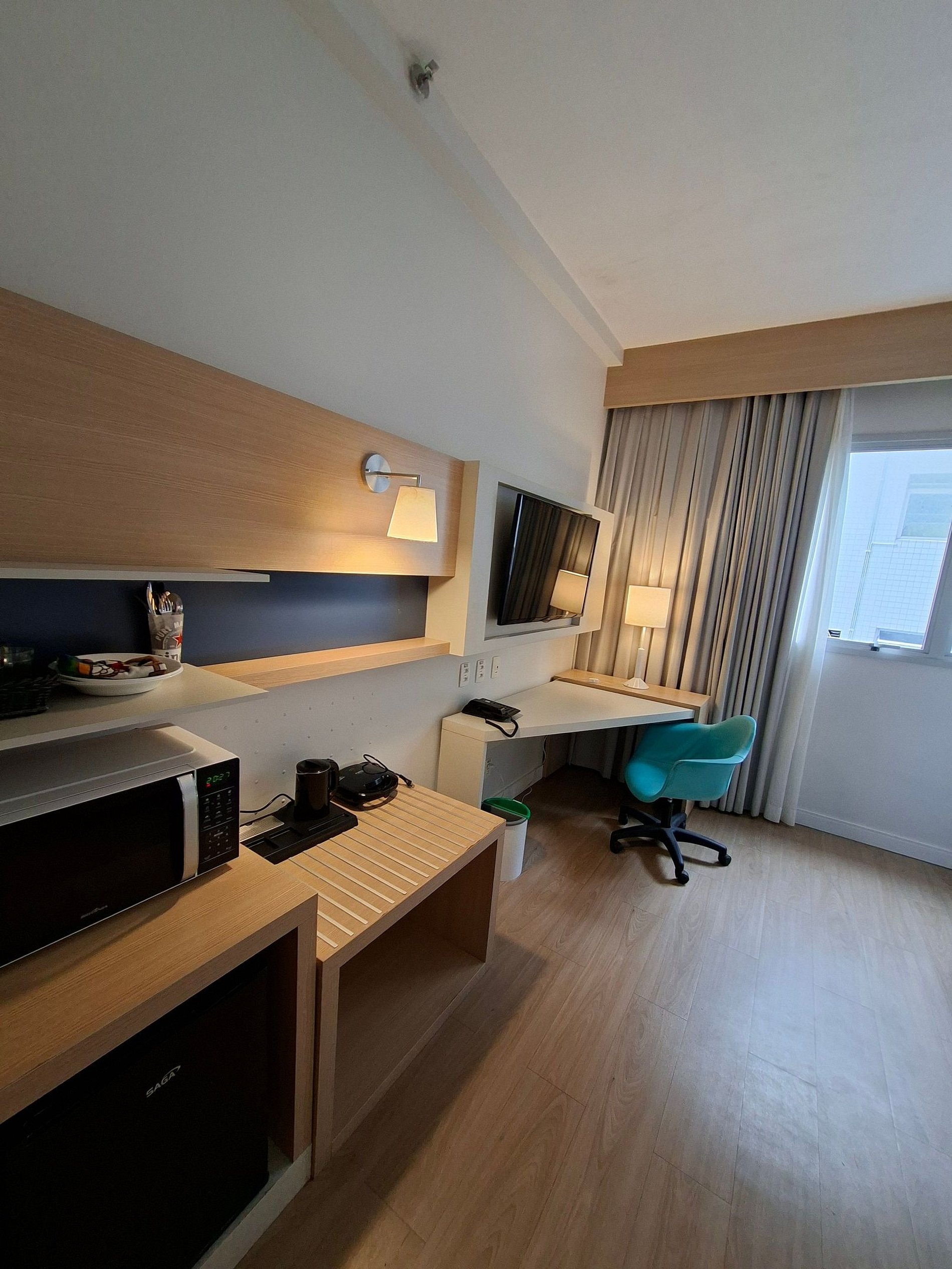 Conta com cama KING, micro-ondas, sanduicheira, ar-condicionado, Wi-Fi, mesa de trabalho, Smart TV, armário, roupa de cama e toalhas.