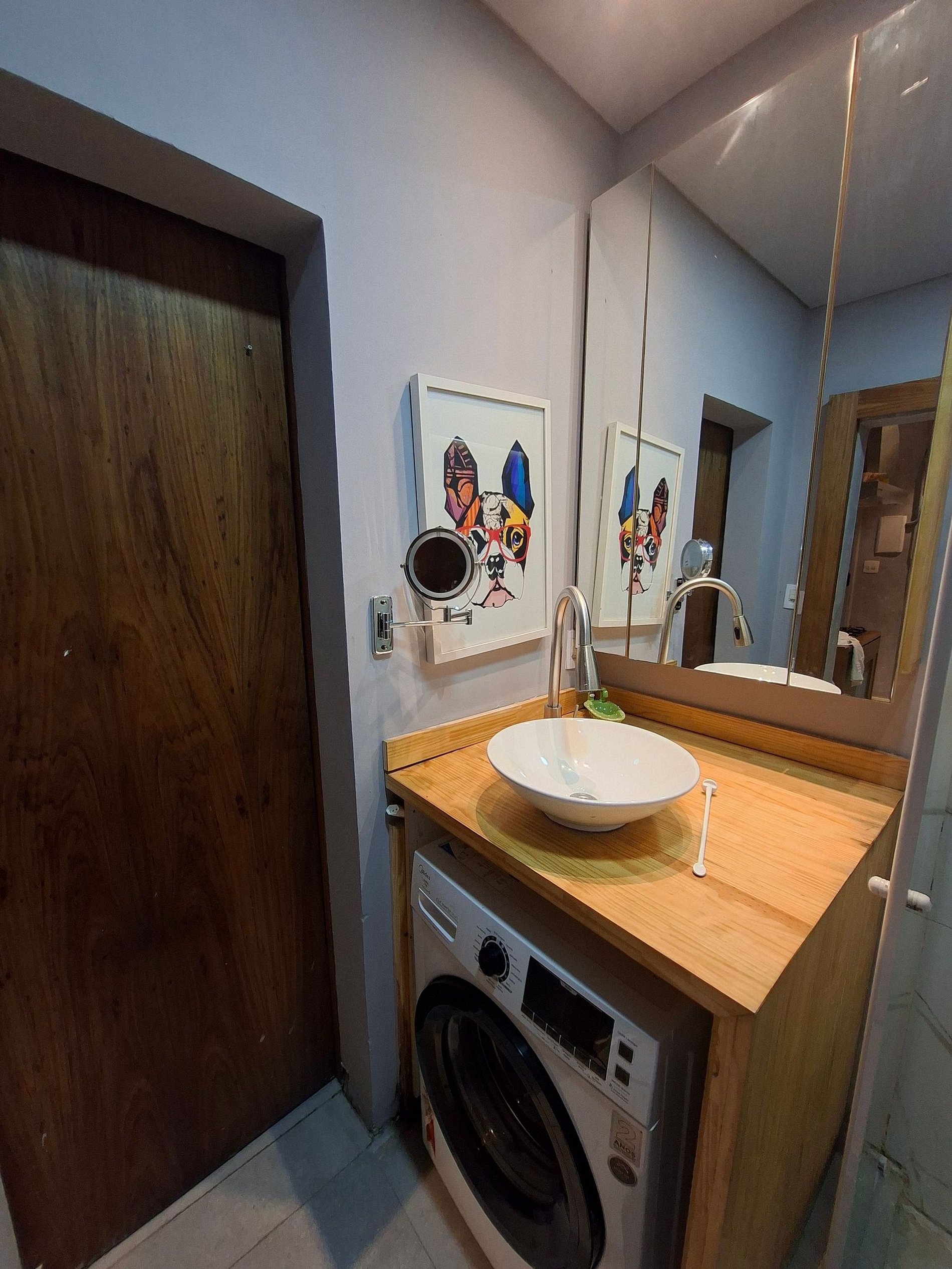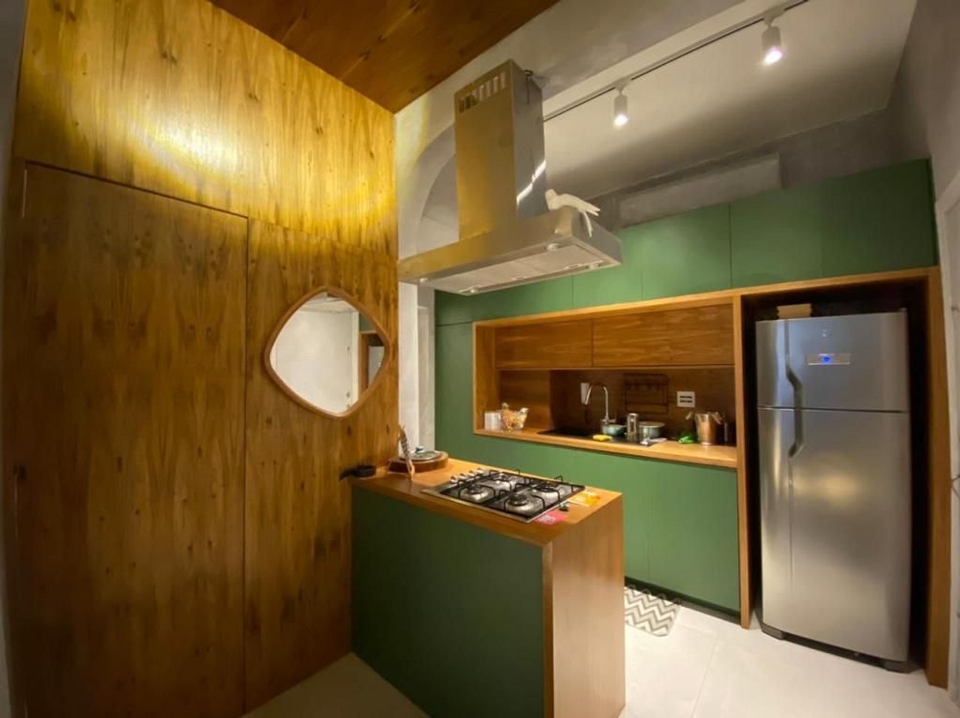 A cozinha equipada e a marcenaria planejada garantem praticidade no dia a dia, enquanto o quarto proporciona organização e descanso com conforto. Um espaço ideal para relaxar e se sentir em casa durante a estadia.